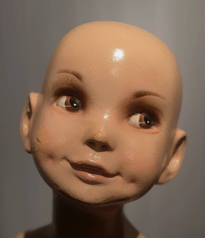 Gekocht in Nijmegen samen met Dorus - verstelbare armen-been met veren - handen origineel van rubber helaas craquelé (leeftijd)